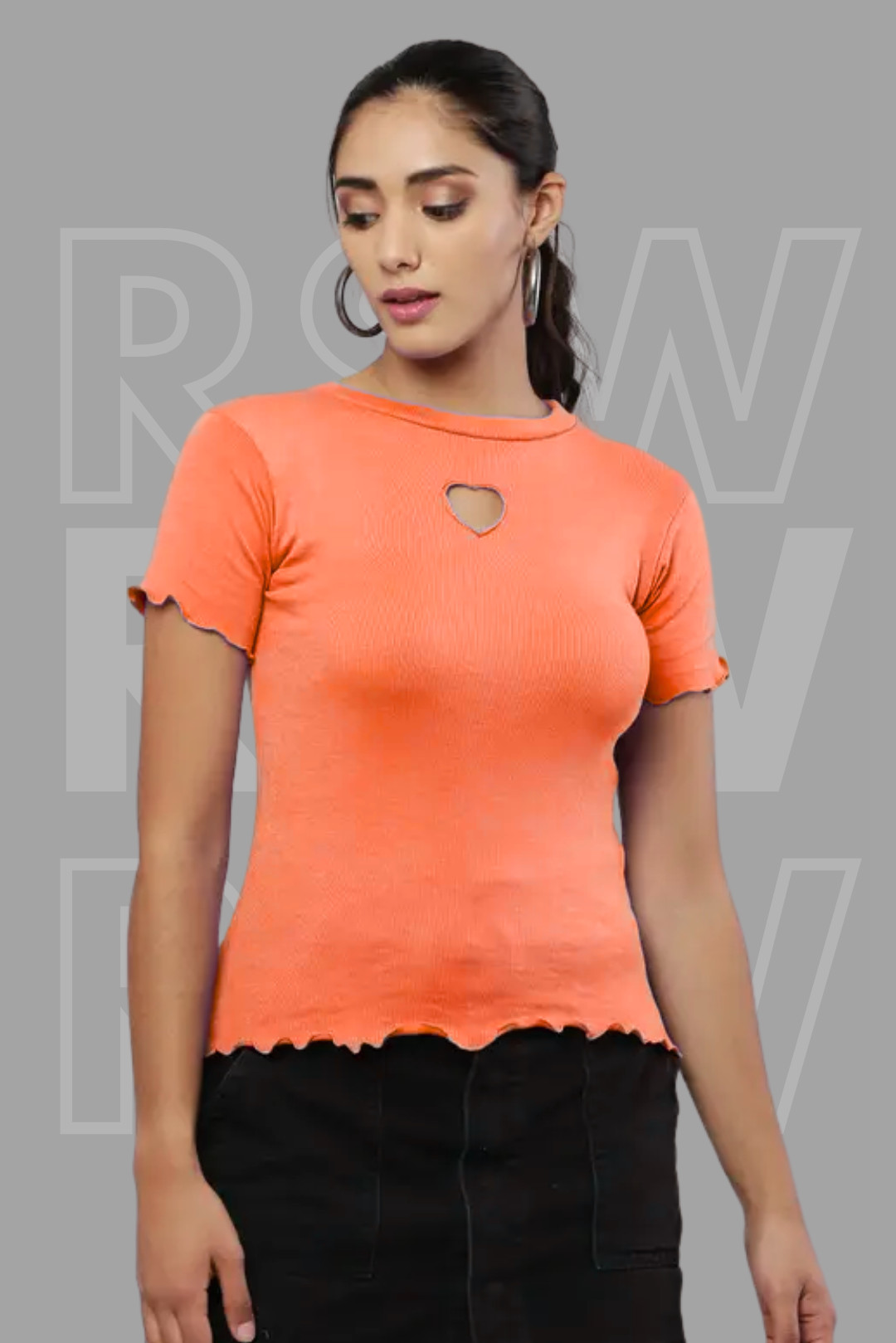 Add a trendy twist to your wardrobe with this Peach Rib Knit Top featuring a unique heart-shaped cut-out – a perfect blend of style and comfort for any season.