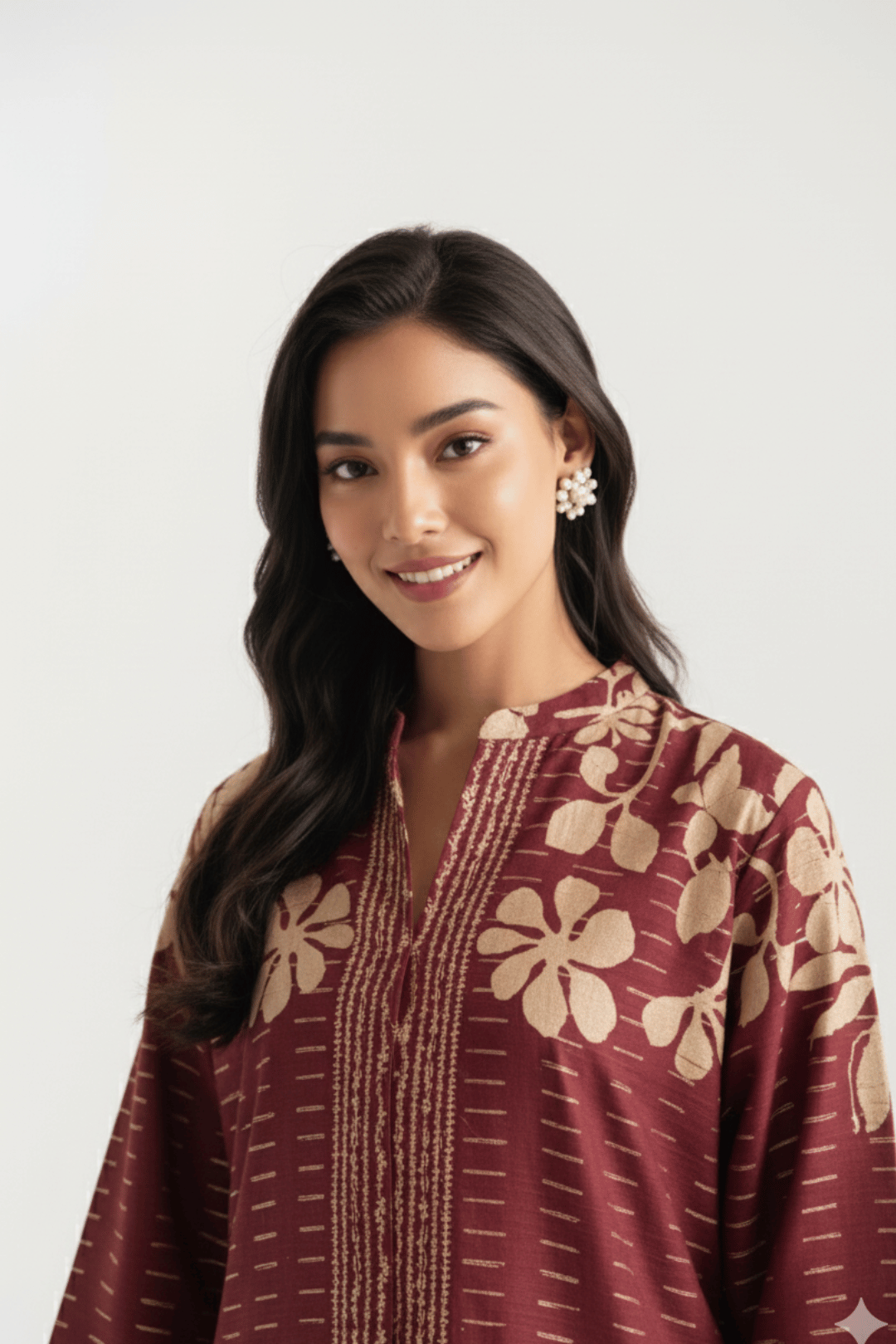 Design: The straight-cut kurta features a sophisticated print with bold red and blue flowers and an innovative maroon or burgundy hue, bordered by intricate geometric and floral patterns.