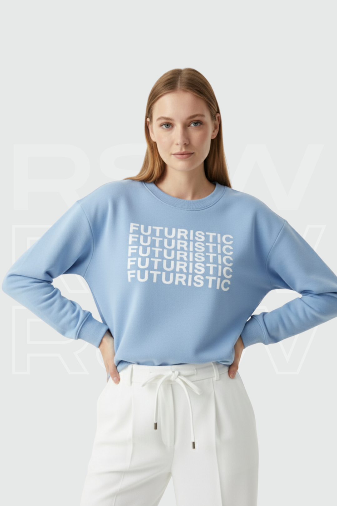 The outfit features a light blue sweatshirt with a repeating "FUTURISTIC" graphic, giving it a sharp, modern edge. The bright blue color provides a refreshing contrast to the bottom piece. The set is grounded by crisp white wide-leg trousers that are thoughtfully tailored. The high-waisted fit and beautiful drape ensure an elongating, polished silhouette that elevates the entire look.