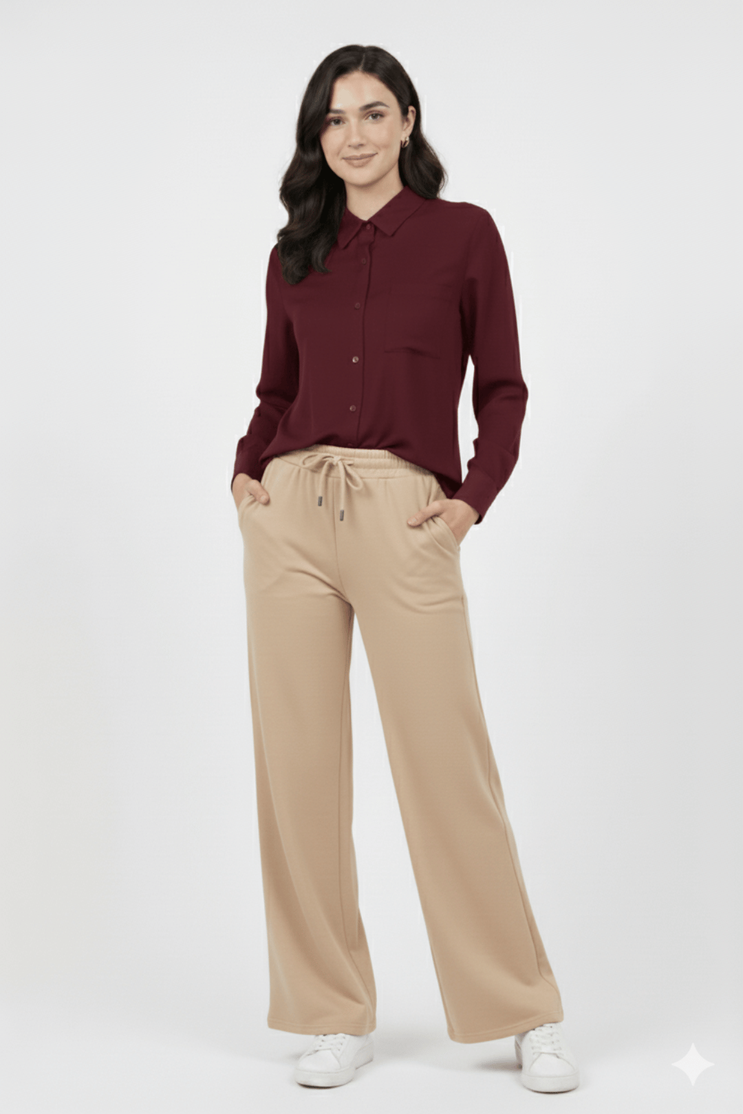 Paired perfectly with wide-leg flapper pants in a soft beige tone, these pants bring an elegant flow and relaxed fit. The elastic waistband with a drawstring adds an adjustable, comfortable touch, making it ideal for long wear. The minimalist design allows versatile styling—pair with sneakers for a casual day or heels for an elevated office look.