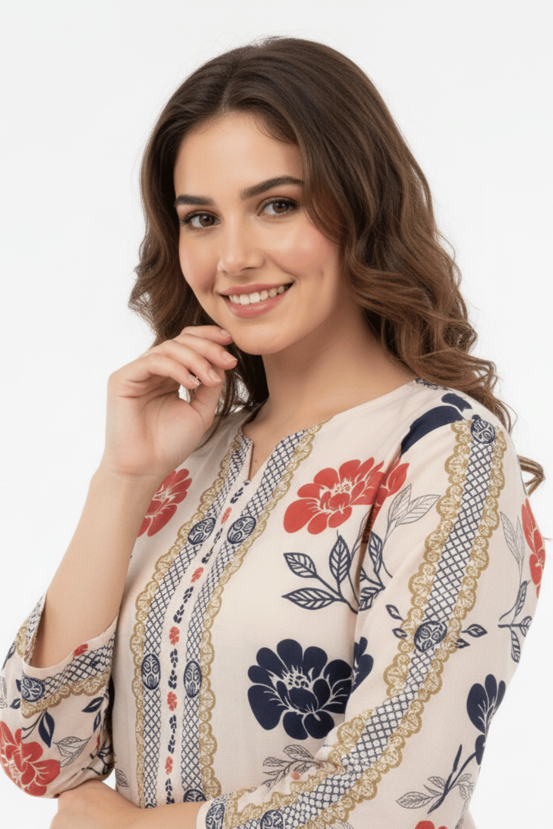 Design: The straight-cut kurta features a sophisticated print with bold red and blue flowers and an innovative pineapple motif, bordered by intricate geometric and floral patterns.
