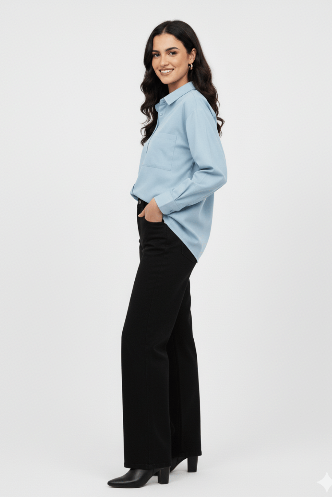 Experience the perfect blend of elegance and comfort with this women’s button-down shirt in Light Blue. Made from luxurious soft fabric, this long sleeve shirt drapes beautifully, giving you a refined and polished look for any occasion.