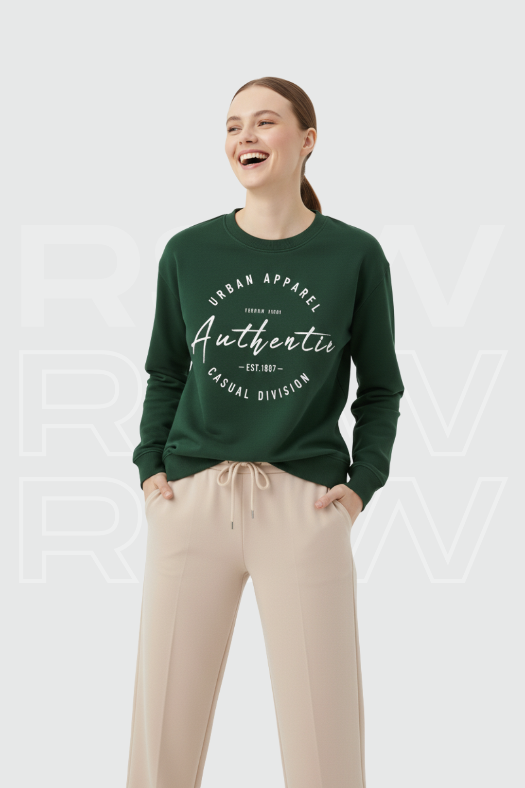 The coordinated set features a rich dark green sweatshirt with an "Authentic Urban Apparel" graphic, adding a cool, vintage-inspired touch. This is perfectly balanced by the beautiful light beige (or 'nude') trousers. These high-waisted, wide-leg trousers offer a comfortable, fluid drape and an elongating silhouette that moves seamlessly from home to the high street.