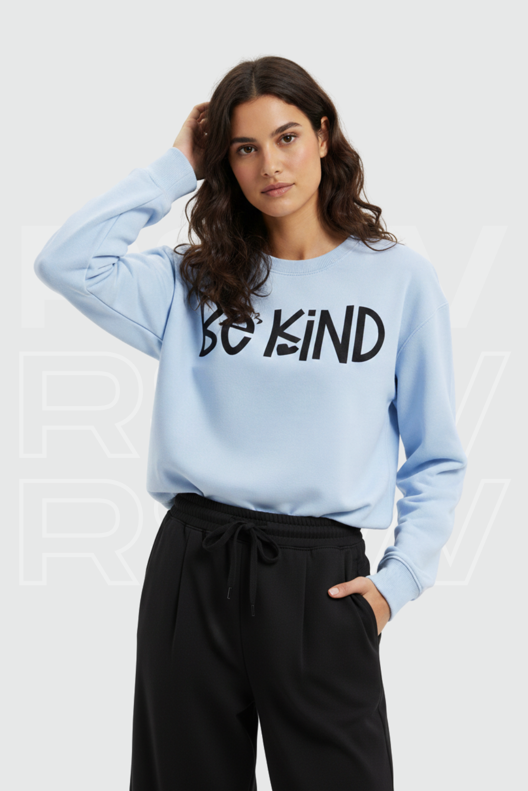 The outfit centers around the soft light blue sweatshirt, featuring the bold, inspiring message "BE KIND". This cheerful top brings a positive vibe to your everyday wear. The sweatshirt is beautifully paired with black cropped wide-leg trousers. The shorter length and generous cut create a fashionable, culotte-style silhouette that is both flattering and comfortable, finishing perfectly above the ankle.