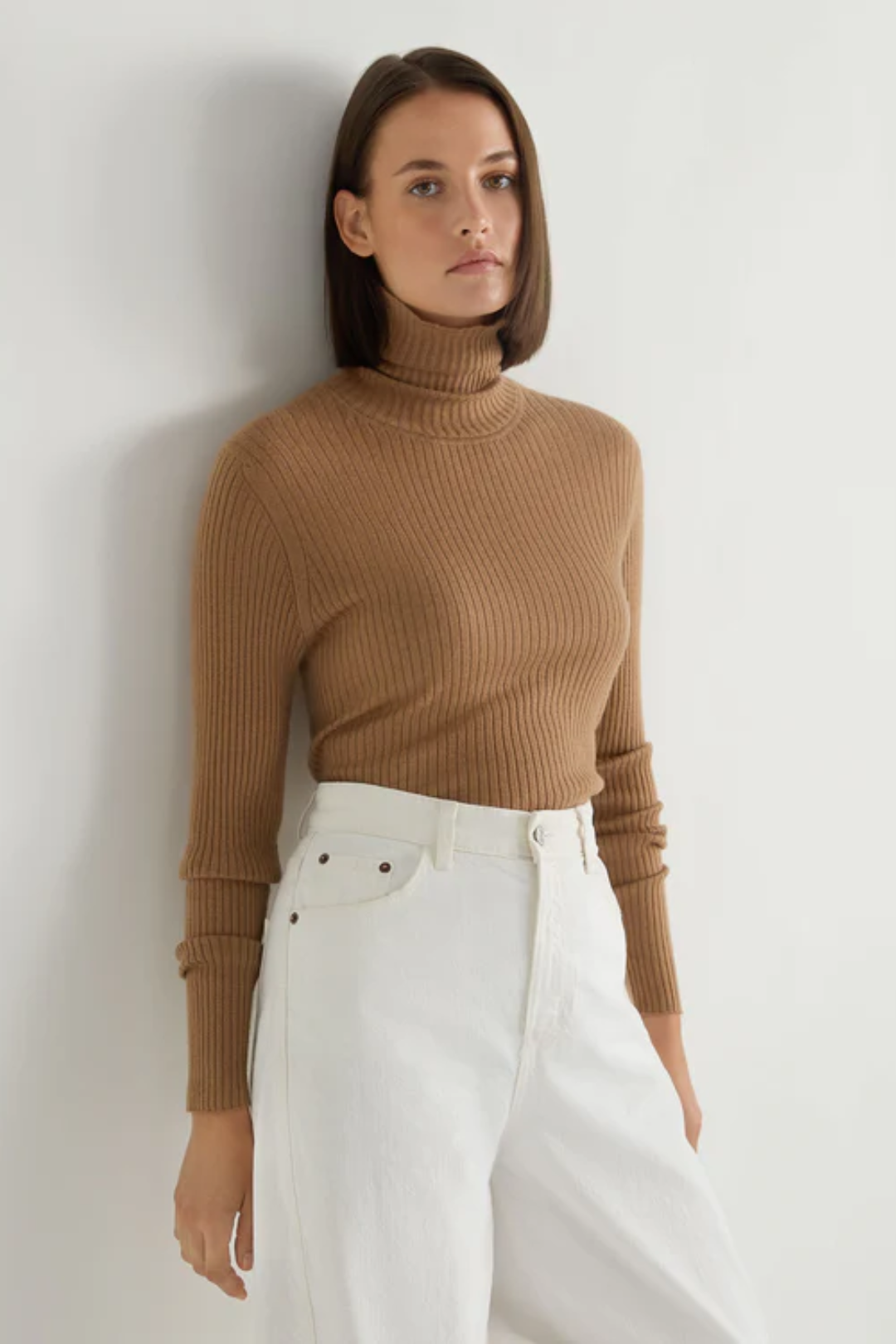 Stay warm and stylish with this sleek Camel Brown Rib Knit Turtleneck, a wardrobe essential for any season.