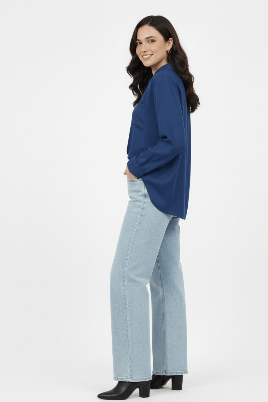 Experience the perfect blend of elegance and comfort with this women’s silk button-down shirt in Blue. Made from luxurious soft silk fabric, this long sleeve shirt drapes beautifully, giving you a refined and polished look for any occasion.